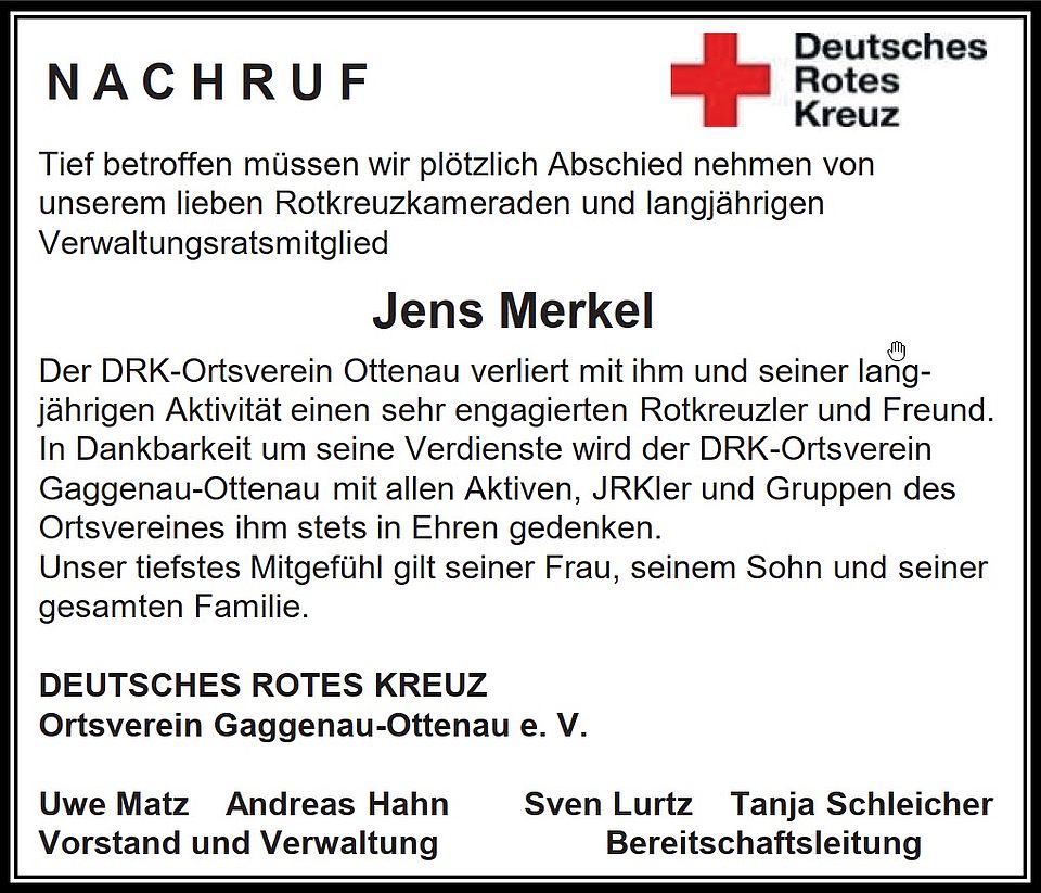 Tief betroffen müssen wir Abschied nehmen von unserem lieben Rotkreuzkameraden und langjährigen Mitgleid Jens Merkel