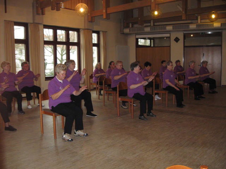 Mit viel Elan zeigten die Teilnehmer der Gymnastikgruppe, unter Leitung von Petra Hauser, wie die Schultern gelockert werden können, nach der Musik Walking and Whistling. Nach dem Walzerrhythmus La Provence zeigte sie ein ansprechende Bewegungsfolge mit den Reifen. Mit der schwungvollen Paprika-Lady wurden die Besucher des Seniorenkreises angeregt und aufgefordert, doch selbst einmal mitzumachen, was einige Personen gerne taten. Die Stuhlgymnastik für Hände und Füße mit der Musik "Der Meretenmixer" fand großen Anklang.